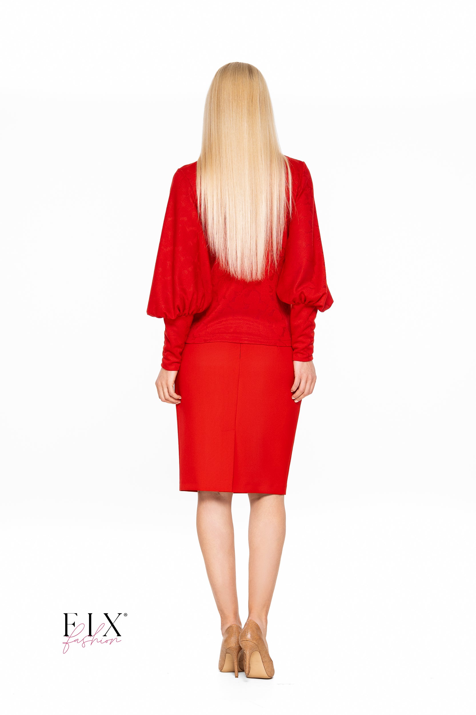 Un compleu deosebit compus din fusta conica si bluza gen maleta cu maneci bufante. Fusta este realizata din stofa usor elastica si este captusita. Maleta este realizata din jerse calitate premium.